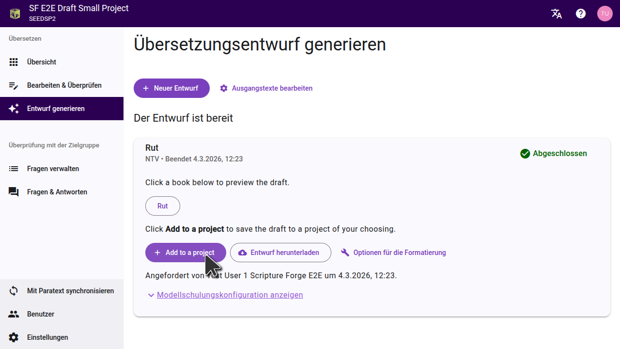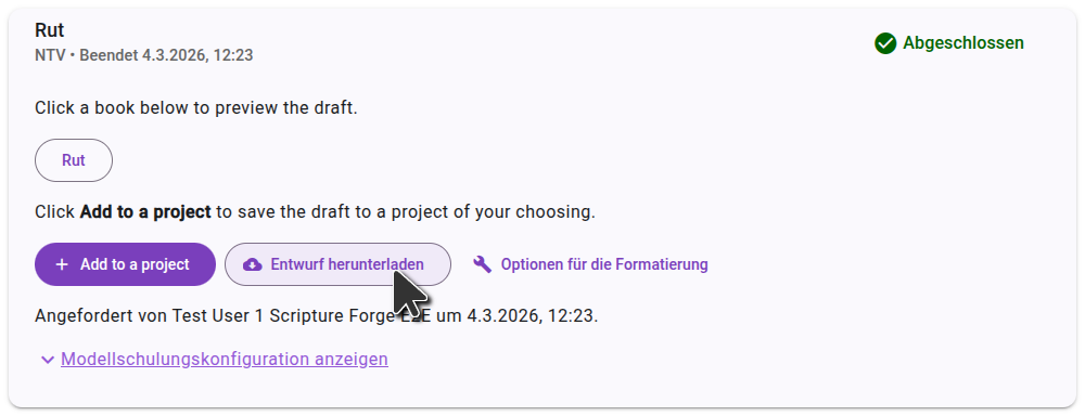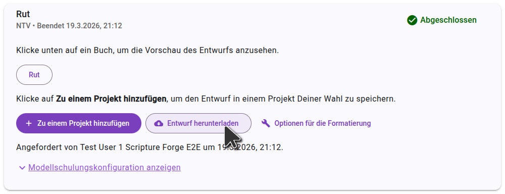 Scripture Forge zeigt an, wenn Dein Entwurf fertig ist und listet die Bücher auf, die erstellt wurden. Generierte Entwürfe werden nicht automatisch in Dein Projekt importiert. Aus Entwürfe Generieren kannst Du eine Voransicht öffnen oder Entwürfe importieren.