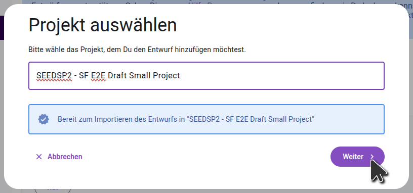Wähle im sich öffnenden Dialogfeld das Projekt aus, in das der Entwurf importiert werden soll. Wichtig: Das Importieren des Entwurfs ersetzt alle vorhandenen Inhalte im Projekt für dieses Buch.