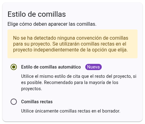 Hay dos opciones para el estilo de la cita. El valor por defecto es "automático", lo que se recomienda para la mayoría de los proyectos. Cuando seleccione una opción, una vista previa se muestra en el lado derecho de la página para ayudarle a entender cómo las opciones afectarán el formato de su borrador.
