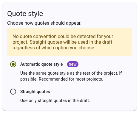 There are two options for quote style. The default is "automatic" which is recommended for most projects. When you select an option, a preview is shown on the right side of the page to help you understand how the options will affect the formatting of your draft.