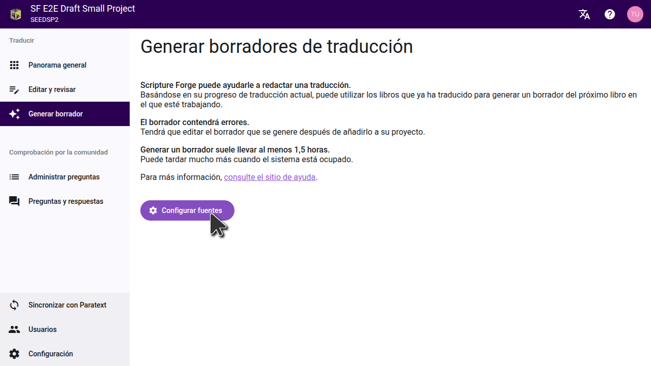 Después de rellenar el formulario, el equipo de Scripture Forge revisará su solicitud y trabajará para encontrar la mejor configuración para su proyecto. Se le proporcionará uno o más borradores para revisar. Si decide que la generación de borradores es adecuada para su proyecto, el equipo habilitará la generación de borradores en su proyecto y le guiará en el proceso de selección de los ajustes que hayan resultado mejores.