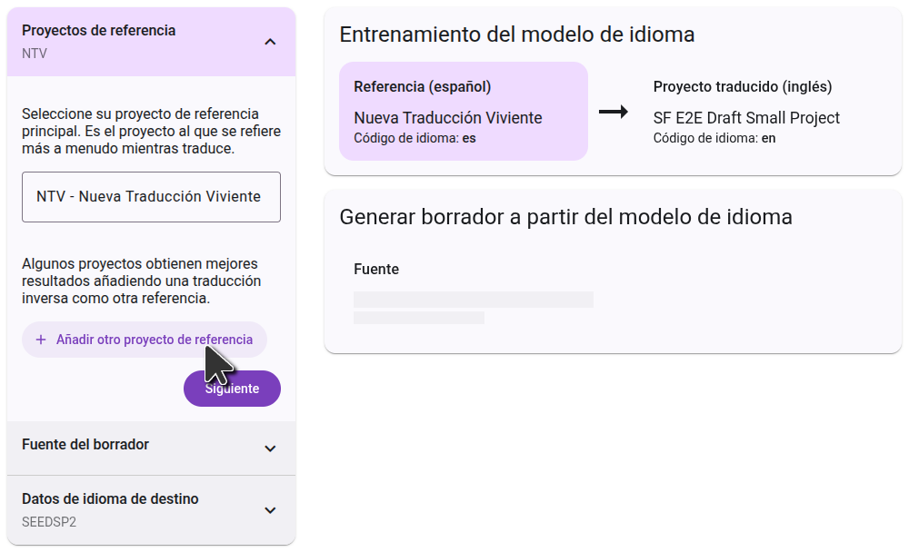 A la derecha, verá un diagrama de cómo se utilizarán los proyectos seleccionados para generar el borrador. En el primer paso, el modelo lingüístico aprenderá comparando los proyectos de referencia con el proyecto traducido. En el segundo paso, utilizará esos conocimientos para traducir el proyecto fuente.