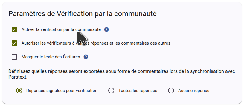 Pour utiliser la vérification communautaire de Scripture Forge, vous devez d'abord vous connecter à Scripture Forge à l'aide de vos identifiants Paratext et connecter votre projet. Une fois que votre projet est connecté, accédez aux Paramètres et descendez jusqu'à la section Vérification de la Communauté. Assurez-vous que la case à cocher « Activer la vérification de la communauté » est sélectionnée comme indiqué dans la capture d'écran ci-dessous