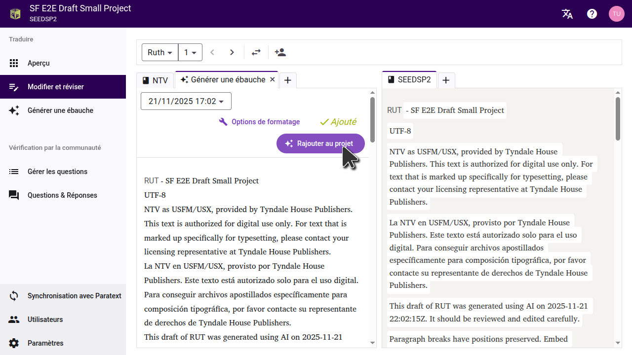 Une fois que vous avez importé l'ébauche dans un projet, synchronisez le projet dans Scripture Forge puis faites un Envoyer/Recevoir dans Paratext pour voir les changements.
