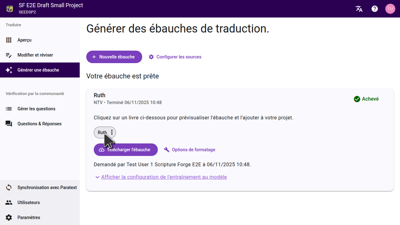 Lorsque votre ébauche est terminée, Scripture Forge vous indiquera qu'il est prêt et affichera la liste des livres qui ont été rédigés.