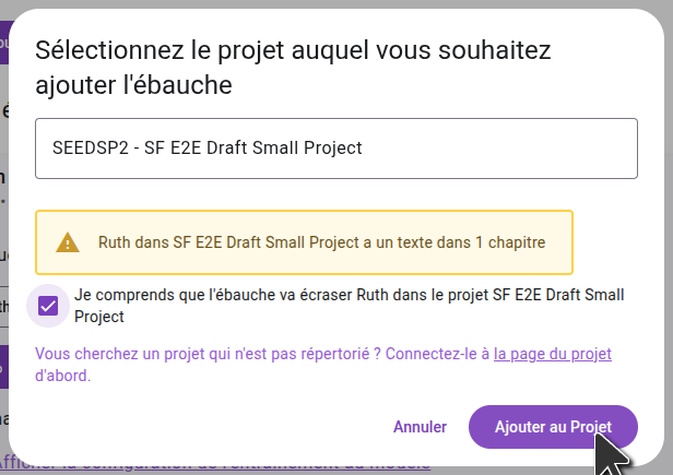 Dans la boîte de dialogue qui s'ouvre, sélectionnez le projet dans lequel vous voulez importer l'ébauche. Si le projet n'a pas encore été connecté à Scripture Forge, vous devrez d'abord le connecter. Important: Importer l'ébauche remplacera tout contenu existant dans le projet pour ce livre.