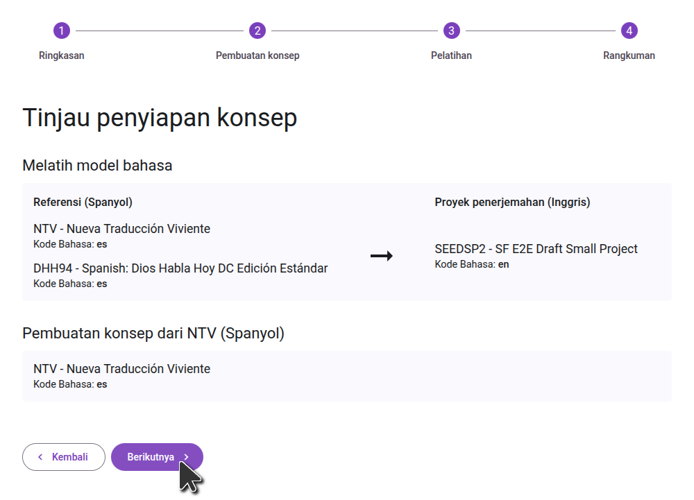 On the first screen, review the configured sources and language codes and verify that they are correct. Then go to the next step.