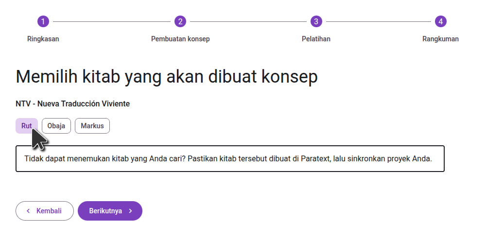 On the second step, select the books you want translated. If the book you want to draft does not exist in your Paratext project, you will need to create the book in Paratext first. In general we suggest drafting one book at a time, though if you are drafting smaller books, you may want to draft several at a time.