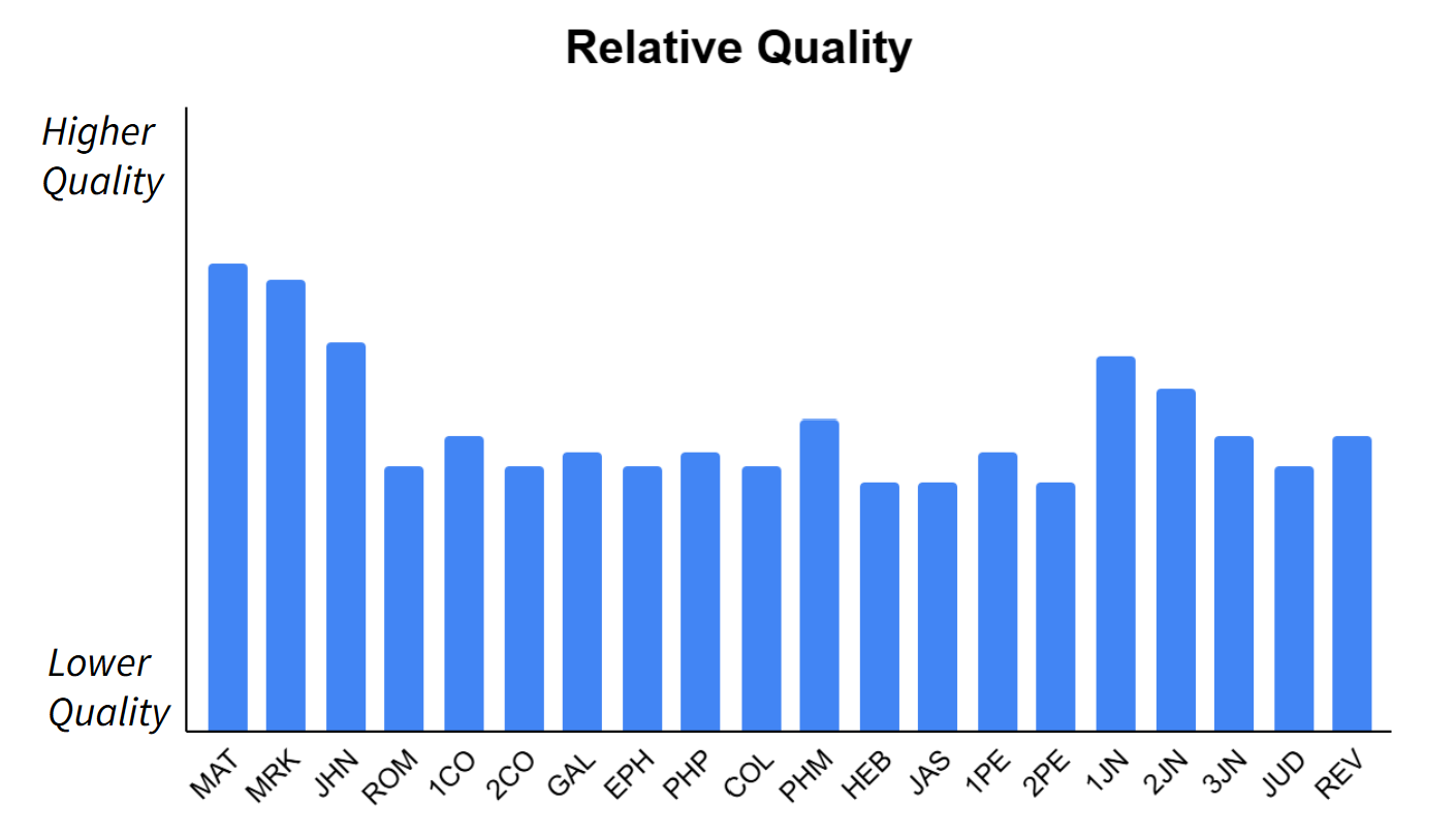 With the introduction of New Testament draft generation, Scripture Forge has developed a method of estimating the quality of the generated draft. Book-level draft quality can be used as a guide for strategic decisions regarding book sequencing. Chapter-level draft quality can be used to evaluate the need for incremental draft generation, or to anticipate the time needed for editing, improvement, and checking. It is important to understand these values as draft quality estimates, and use them for general insights and guidance, rather than as quality checking tools.