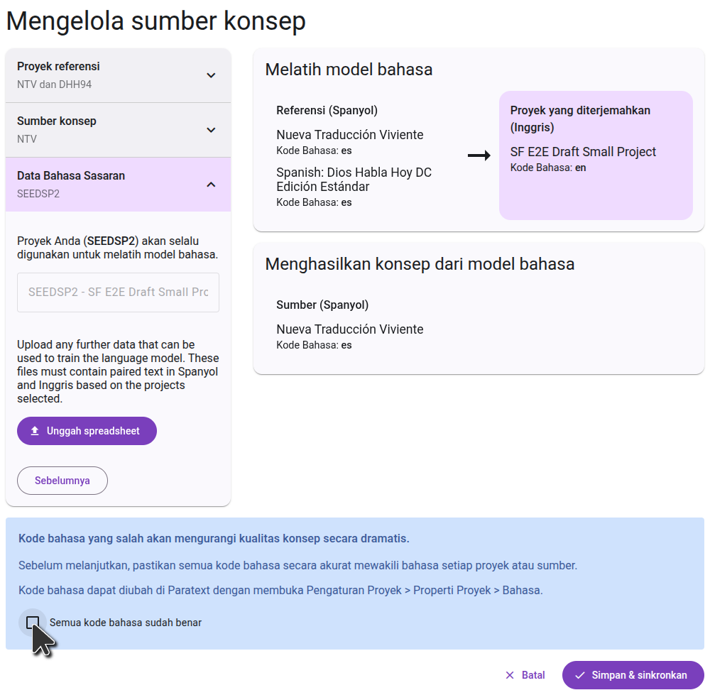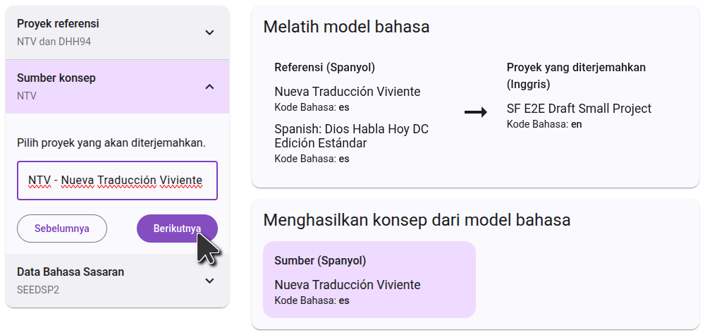 On the right side, you will see a diagram of how the projects you selected will be used to generate the draft. In the first step, the language model will learn by comparing the reference projects to the translated project. In the second step, it will use that knowledge to translate the source project.