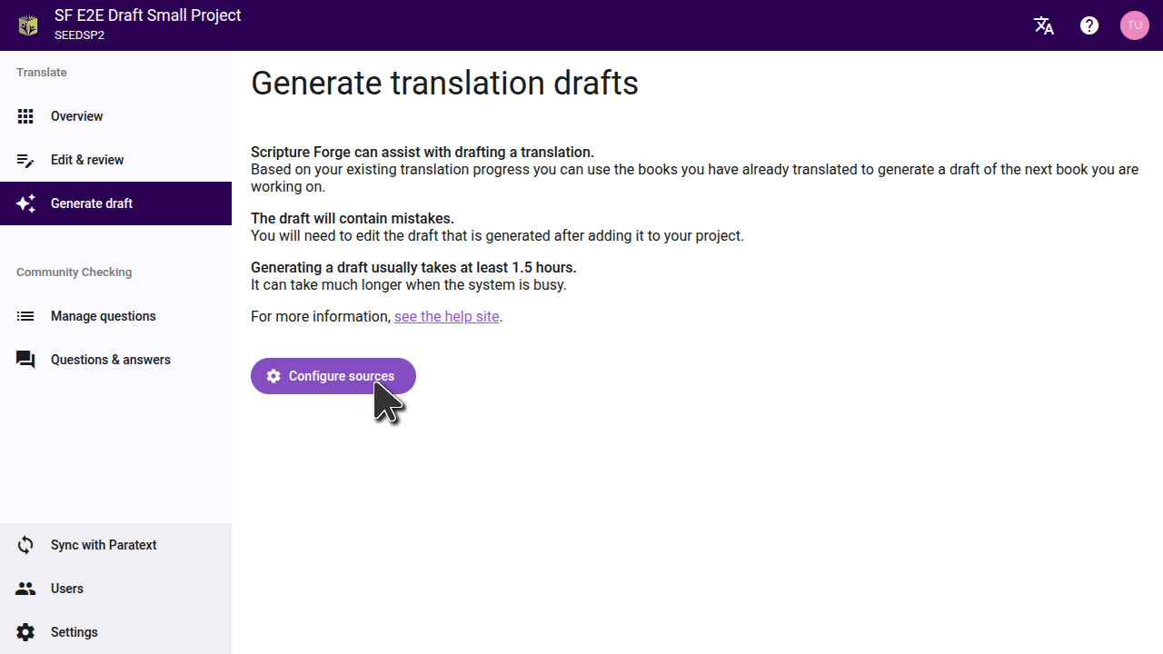 After you fill out the form, the Scripture Forge onboarding team will review your request and work to find the best settings for your project. You will be provided with one or more drafts to review. If you decide that generating drafts is right for your project, the team will enable drafting on your project and guide you through the process of selecting the settings that were found to be best.