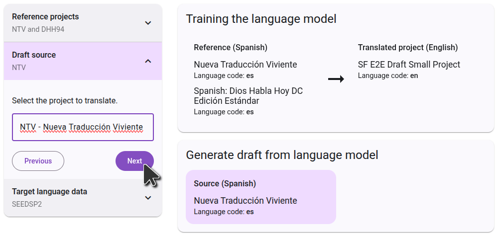 On the right side, you will see a diagram of how the projects you selected will be used to generate the draft. In the first step, the language model will learn by comparing the reference projects to the translated project. In the second step, it will use that knowledge to translate the source project.