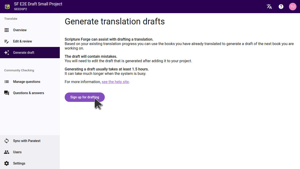 To generate drafts in Scripture Forge, click on the "Generate Draft" button in the main menu. Then click the "Sign up for Drafting" button, and fill out the form that opens, to get access for your project. Back translation projects are enabled by default and do not need to fill out the form.