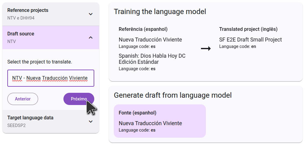 On the right side, you will see a diagram of how the projects you selected will be used to generate the draft. In the first step, the language model will learn by comparing the reference projects to the translated project. In the second step, it will use that knowledge to translate the source project.