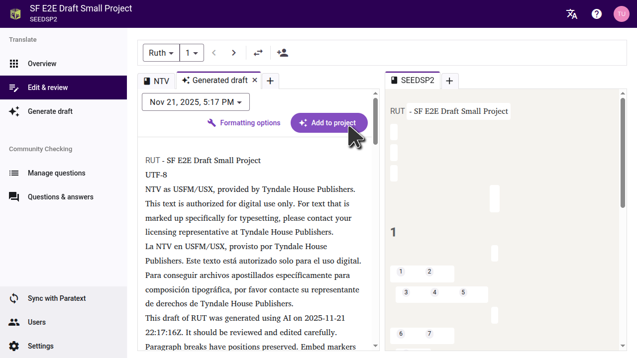 If you prefer not to import the draft directly to your project, you can also download the draft as USFM files. On the "Generate draft" page, click "Download draft", and extract the files on your computer. You can then import these files into a project in Paratext.